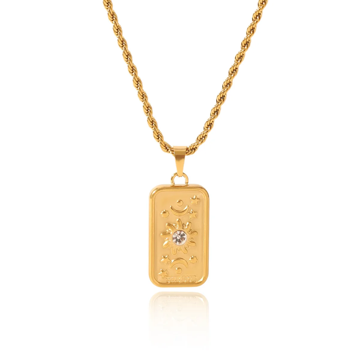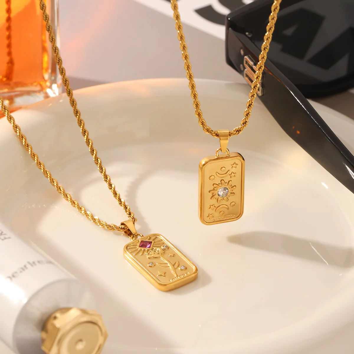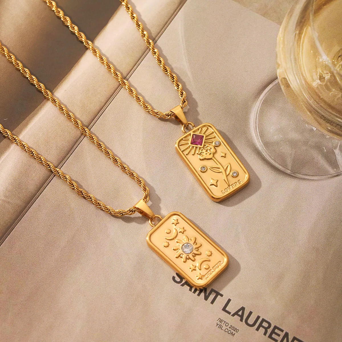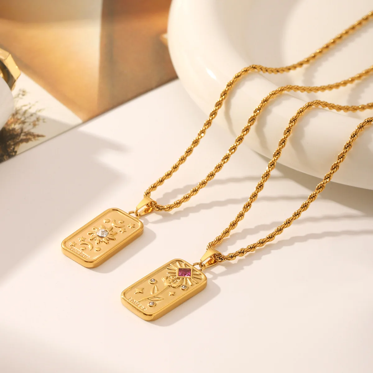 MW Fashion 18K Gold Plated Stainless Steel 3D Relief Diamond Set Flowers Octagons Rectangular Pendant Necklace Jewelry Women